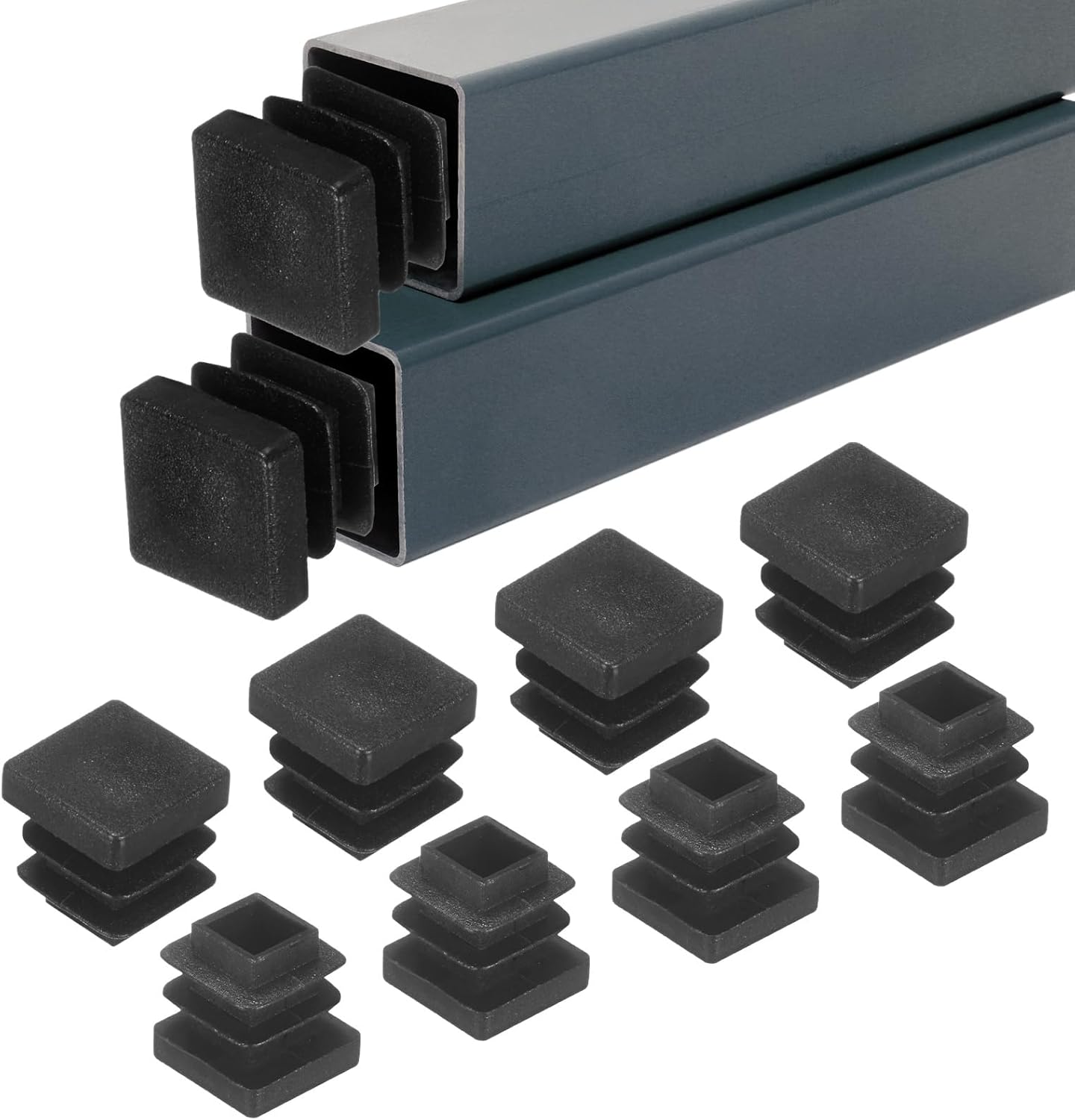 PRODUCT APPLICATIONS The square tubing inserts are widely used for chair legs, table legs, shelf legs, furniture end covers, fitness equipment end inserts, bike rack fittings, patio furniture leg tips, any square opening, and other places with exterior decoration. PRODUCT DETAILS & INCLUDE √ Material: PE √ Color: Black √ Overall Size: 2.4x2.4x0.7Inch/60x60x19mm(L x W x H)√ Fits: 2.4x2.4 Inch Square Tubing√ Bottom Thickness: 0.158Inch/4mm√ Package Includes:50Pcs x Square Tubing End CapsPRODUCT ADVANTAGES 1. The black end caps for metal tubing are made of PE (polyethylene) material. The thick base of the pipe plug has impact resistance and wear resistance and the internal ribbed design can provide reliable grip inside the tube, not only waterproof, sturdy, and durable, but it also has a long service life. 2. Our rectangular tubing end caps not only reduce noise and prevent scratching the floor when moving furniture but also provide a clean and safe surface for your furniture and prevent dirt and dust from entering. INSTALLATION It is easy to use and does not require any tools. You can manually install it in a few minutes.