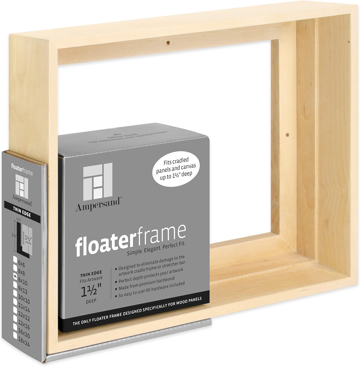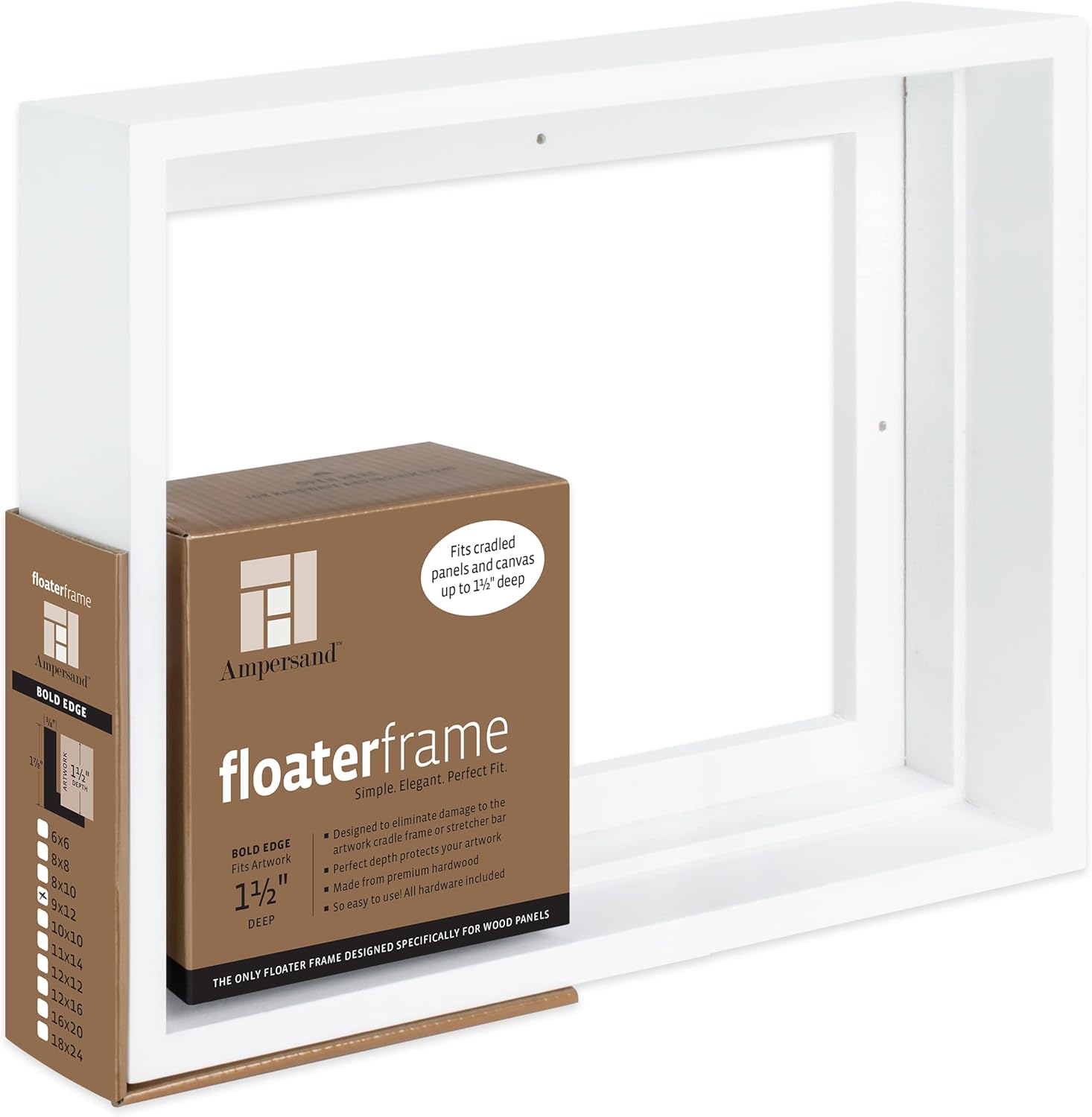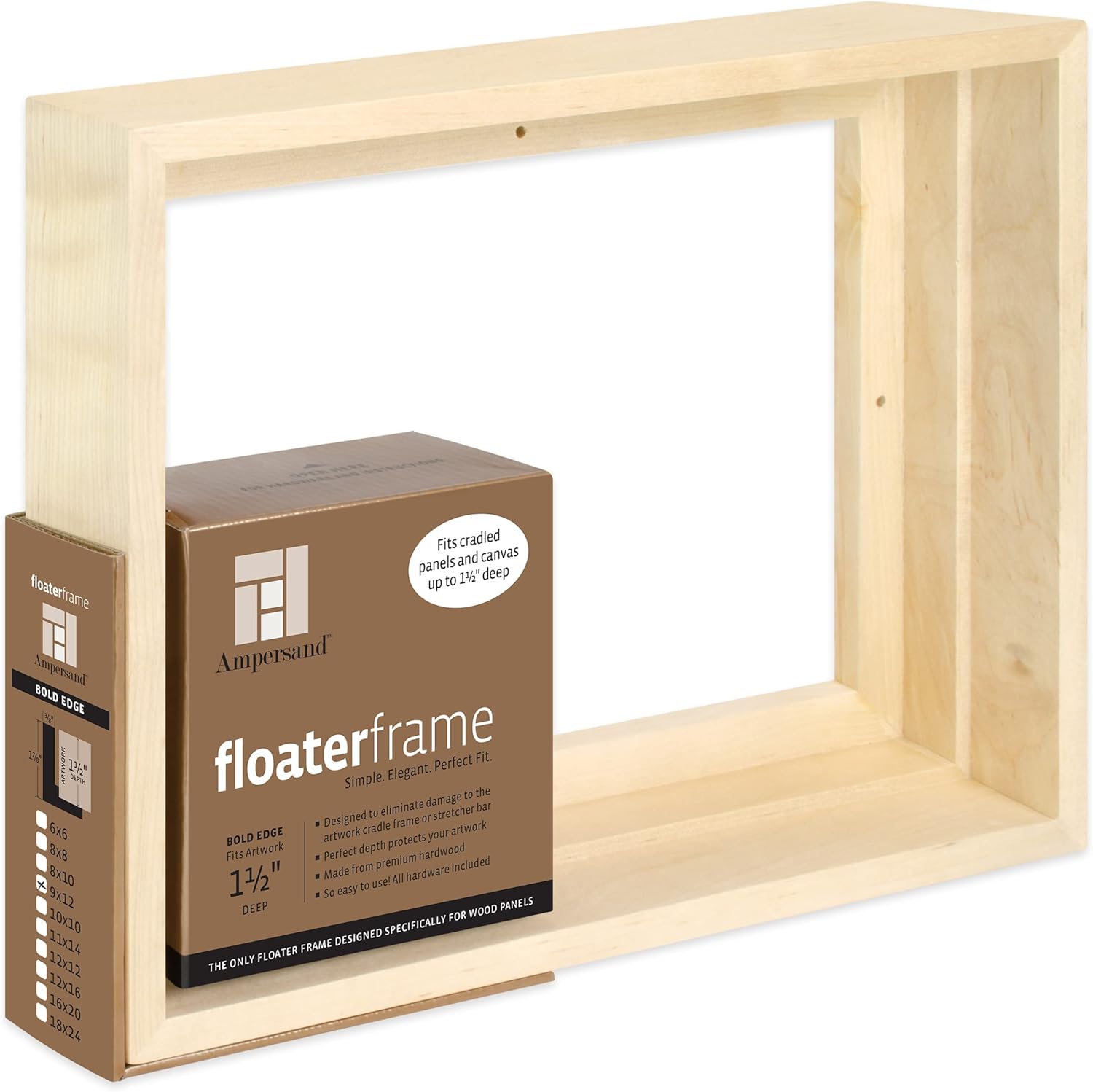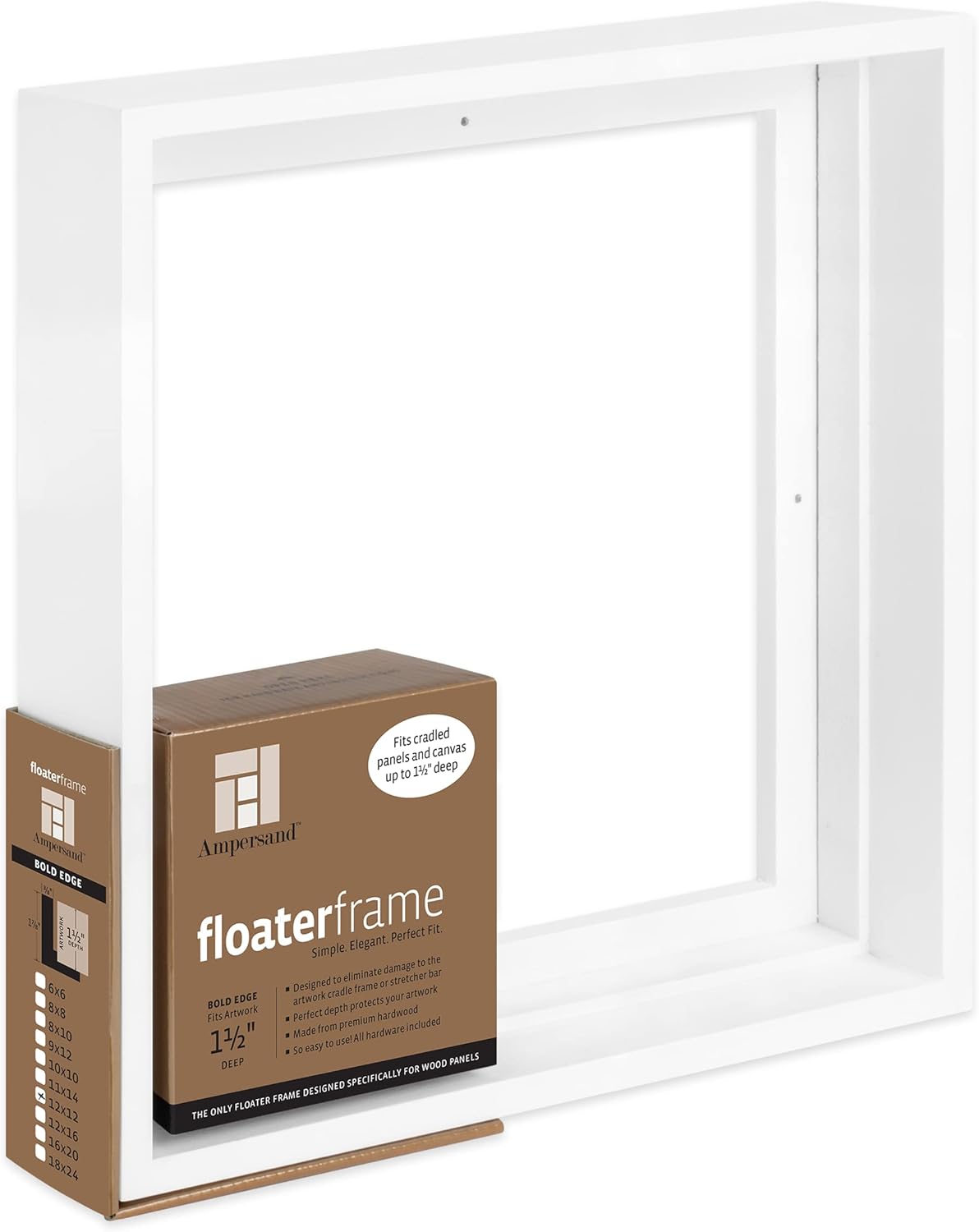 At Ampersand, we noticed the floater frames available to artists didn't properly accommodate wooden panels. We saw that the base of the frame didn't align with the panel's cradle and the front of the frame didn't protect the face of the artwork. Ampersand remedied these issues by expanding the base of its Floaterframe to match up with the cradle of a wooden panel and extending the frame profile, so the artwork sits just below the front of the frame, protecting the artwork from damage. We also added countersunk holes on the back for the hardware, so the screws that attach the artwork to the frame don't protrude. This keeps your artwork flush with the wall and prevents screws from scratching the wall. Not only did we create a better frame, but we also took it one more step. Everything you need to frame your artwork is included, from the eye screws and coated wire to screws that attach to the artwork, and bumper pads for the back corners. Even the hook and nail are included so you can display your newly framed artwork. Are you framing a flat panel without a cradle? The 7/8" depth option includes a set of riser blocks in the hardware pack. This is a great solution for displaying your artwork on a panel, even if the panel doesn't have cradles. Ampersand offers two great styles of Floaterframes to choose from: We have a Bold style, with a dramatic wide facing, and a Thin style with an elegant, narrow facing. Both styles are available in Black, White, Maple, and Walnut, and are available for 7/8" and 1 1/2" depth artwork on cradled panels or stretched canvas. With the Bold style, the outer dimensions are the same for both depths. This allows artists to frame artworks with different cradle depths in uniform frames. The Thin style has a different approach. The outer profile for the 7/8" depth is more shallow versus the deeper 1 1/2" profile. Designed for Ampersand panels and ideal for use as a canvas frame. Ampersand Floaterframe: Simply the Easiest Floater Frame You’ll Ever Use.