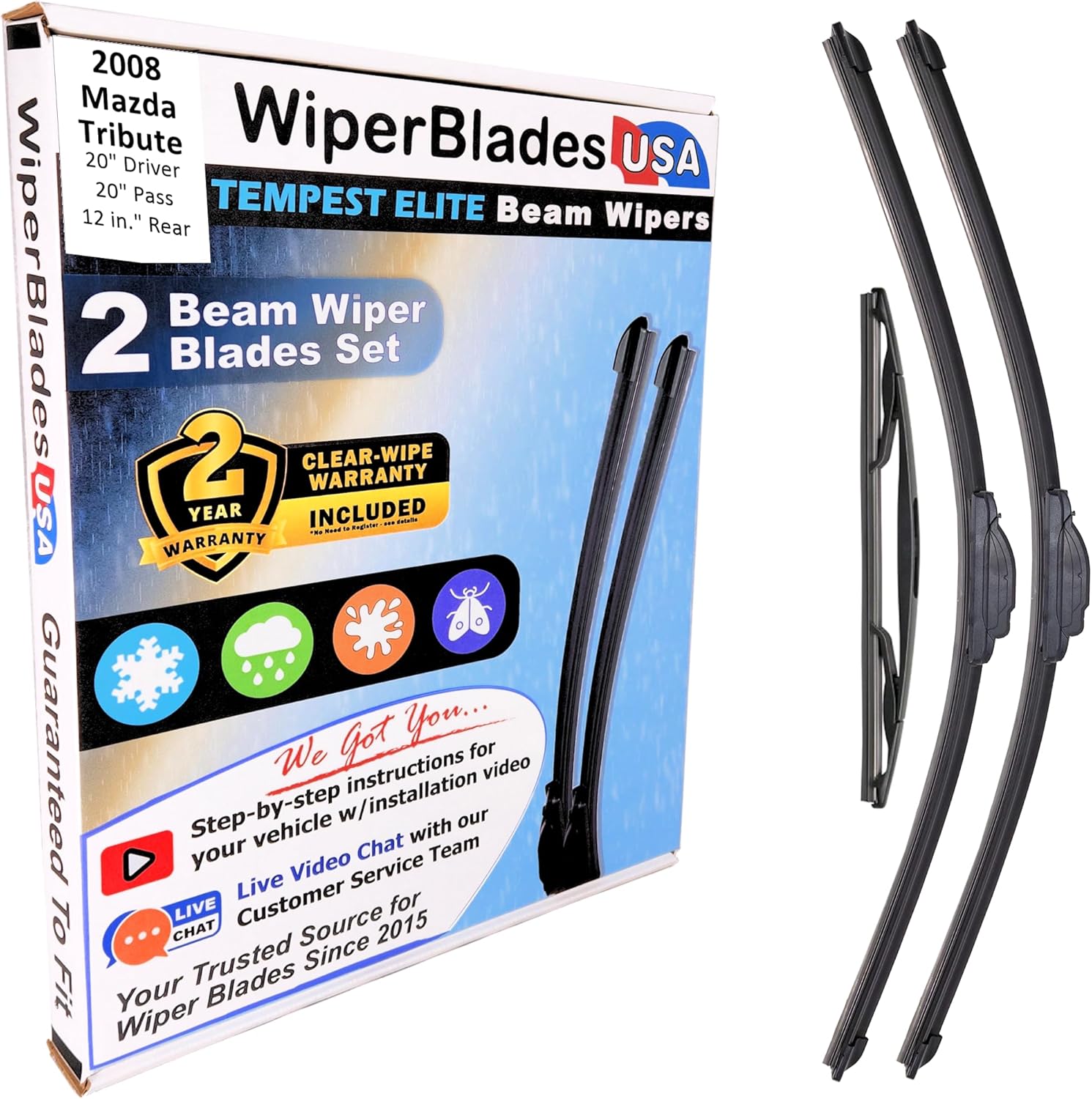 Tempest Elite Beam wiper blades wipers set +Trico ExactFit Rear wiper is compatible with Mazda CX-90 2024WiperBladesUSA Beam Wiper Blades - Durable Flexible Beam Blade The WiperBladesUSA® wiper blade contour to the curvature of your windshield to provide even wiping pressure along the full length of the blade. These wiper blades have a 2 years Wiper Wear Warranty included. Meaning if they stop keeping you safe you get a credit towards a fresh pair. (See Details) Don't get caught in heavy rain without this durable beam wiper blades are designed to be compatible with your Mazda CX-90 2024 Virtually streak-free visibility Great wipers to have in rain, sleet and snow2 years "Clear-Wipe Warranty"Smooth, chatter-free wipe is a result of the specially blended teflon rubber bladeEnhanced flexibility and grip from the durable, rubber-encased substructureSignificant noise reduction and wind lift through a built-in aerodynamic spoiler to keep the wiper on the windshield at freeway speedsAll weather tough wiper blades with a synthetic rubber squeegee that will withstand even the most extreme weather conditionsPrevents ice and snow build-up through the elimination of exposed metal components. Easy Installation: Included in the bundle are directions (w/video) to simple and easy to use step-by-step installation on to your vehicle