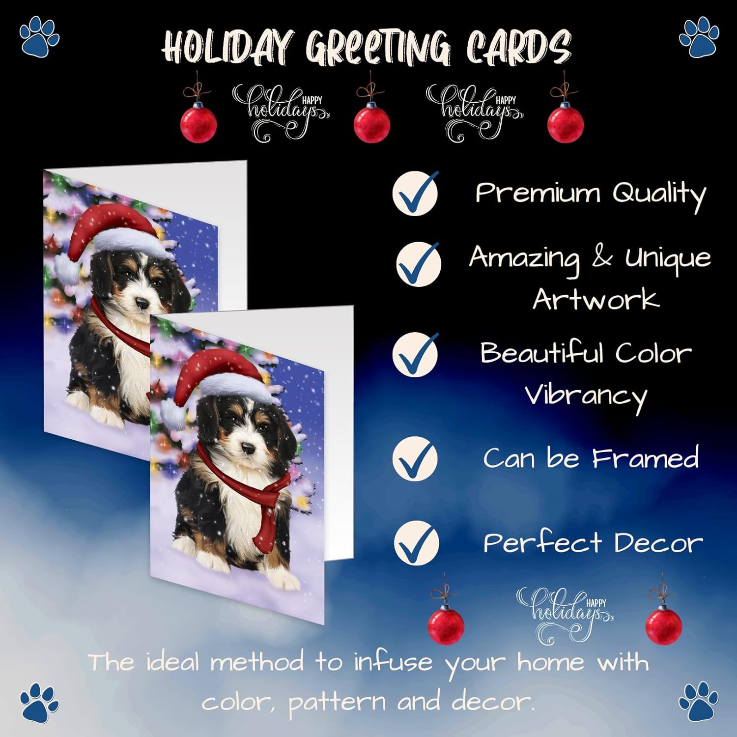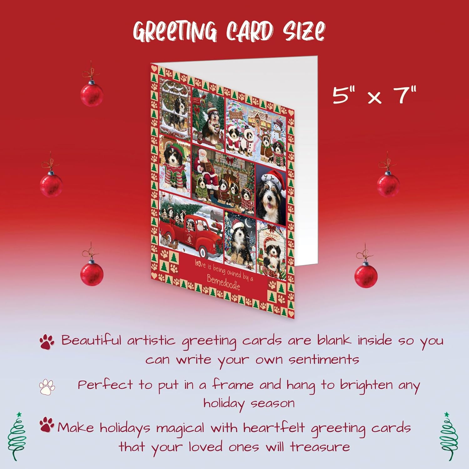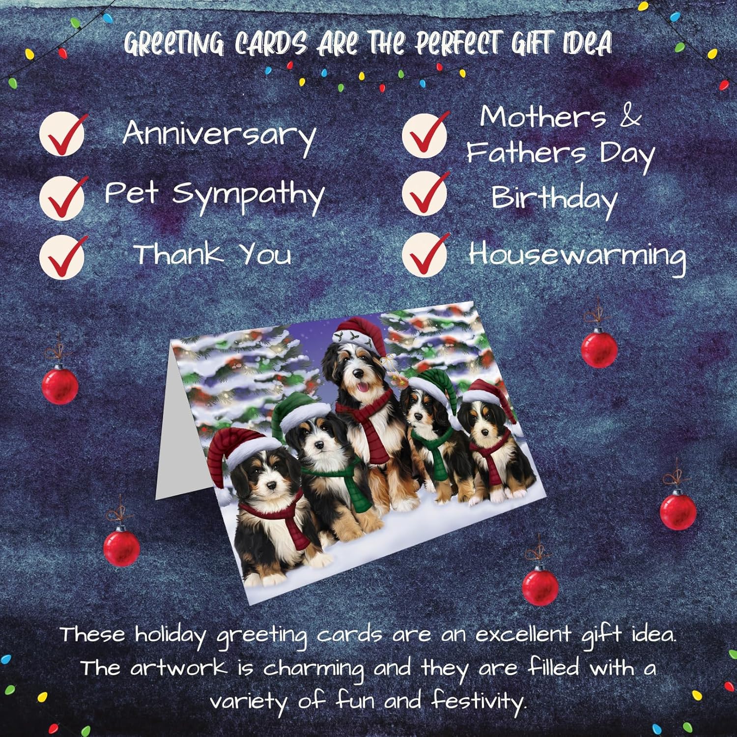 Introducing Our Bernedoodle Dog Greeting Cards with Envelopes! Celebrate the holiday season with our exquisite Bernedoodle Dog Christmas Cards. Crafted on premium, eco-friendly cardstock, these cards showcase vibrant colors and intricate details that truly make them stand out. Measuring at 5 x 7 inches for the Christmas greeting cards and 5.5 x 4 inches for the note cards, each set offers a variety of designs to suit all your festive needs. Inside the cards are blank, providing you with the perfect canvas to pen down your own personalized messages of gratitude and warm heartfelt sentiments to be sent out with love. Each card is accompanied by small envelopes, ensuring your holiday wishes are delivered in style. Key Features: Stylish, vibrant designs that capture the spirit of the season. Blank inside so you can write purposeful and meaningful messages. Printed on high-quality paper stock for a luxurious feel. Each Christmas card is paired with an envelope for a complete gifting experience. Personalize and customize your messages anytime to add that extra personal touch. Smooth, flawless surfaces inside every card for easy writing. Suitable for a wide range of occasions, including Christmas, Mother’s Day, Father’s Day, and more. We take great pride in our dog-themed Christmas cards in bulk, and we're confident you'll love them just as much. However, if for any reason you're not completely satisfied with your purchase, please do not hesitate to contact us. We offer a full refund or replacement, ensuring your satisfaction is our top priority. Bring a touch of canine charm to your holiday cards greetings, and let your loved ones know you're thinking of them with our extraordinary Bernedoodle Dog Greeting Cards.