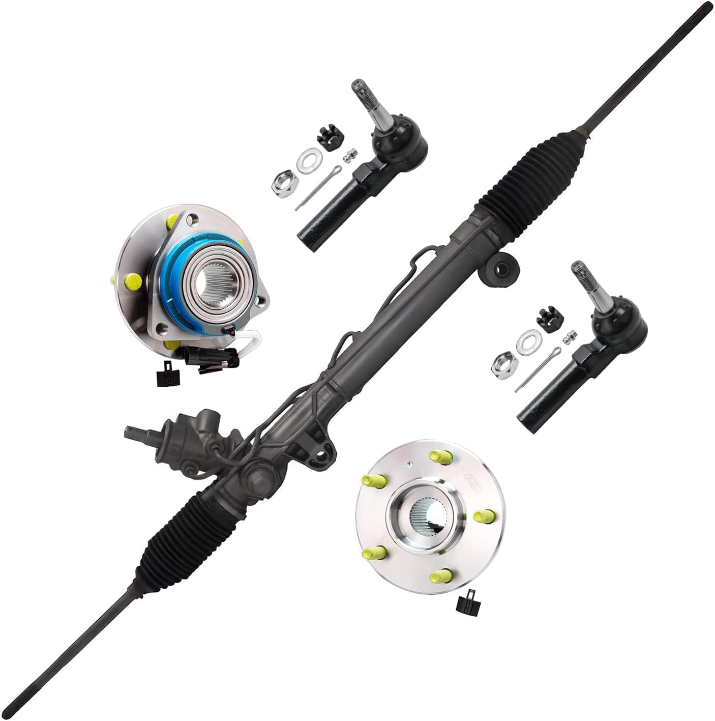 1x Complete Power Rack & Pinion Gear Assembly - 51372x Front Driver & Passenger Side Outer Tie Rod End Links - ES8002862x Front Driver & Passenger Side Wheel Hub & Bearing (ABS on Hub) - 513277Notice: These wheel bearings are for the ABS model. The ABS is the magnetic ring inside of the wheel bearing!Fitment:Replacement for 2008-2017 Buick Enclave (W/ Variable Assist Steering; Supplied With EVO Sensor)Replacement for 2009-2017 Chevrolet Traverse (W/ Variable Assist Steering; Supplied With EVO Sensor)Replacement for 2007-2016 GMC Acadia (W/ Variable Assist Steering; Supplied With EVO Sensor)Replacement for 2017 GMC Acadia Limited (VIN J (11th digit); W/ Variable Assist Steering; Supplied With EVO Sensor)Replacement for 2007 Saturn Outlook (W/ Variable Assist Steering; Supplied With EVO Sensor)Replacement for 2008 Saturn Outlook (XR Model; W/ Variable Assist Steering; Supplied With EVO Sensor)Replacement for 2009-2010 Saturn Outlook (W/ Variable Assist Steering; Supplied With EVO Sensor)Remanufactured in Detroit, MI, USA! All of our Rack and Pinions are air leak tested to assure reliable performance, hydraulically tested for bypass/hi-pressure, road simulation tested, and have tie rod load checked. 100% new o-rings and lip seals to ensures no leaking and quality performance. All new Teflon rings are added to the spool valve on the rack donut, restoring internal sealing of the rack & pinion. Racks are surfaced to OE specifications, the proper surface finish will prevent leaking between chambers and extend unit life.