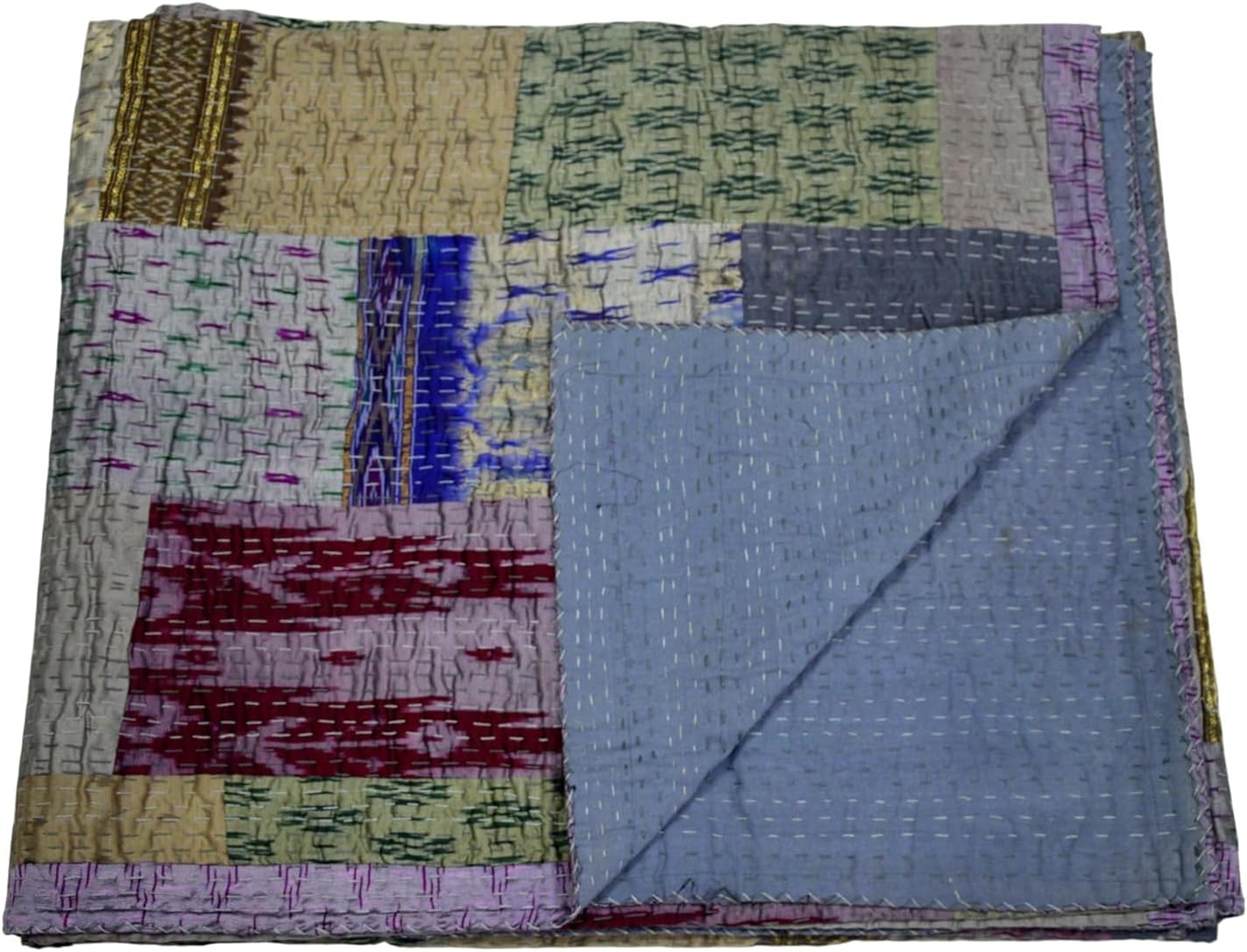 """Vintage indian kantha throw hand-sewn with hundreds of running stitches. Kantha is a uniquely """"quilted"""" texture made from layering colorful vintage Indian cotton/Silk Sari fabrics together. This one-of-a-kind coverlet is reversible with contrasting vibrant patterns & colors. This is Perfect for a twin bed, a beach picnic or slung over a favorite chair, ready for baby showers and well-wishes, Gifts, Make a makeshift pet bed."""