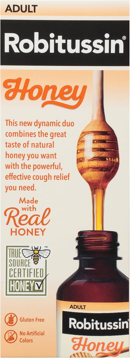 This Robitussin Honey value pack of cough medicine for adults and children 12+ contains day and night cold and cough medicine to relieve your toughest symptoms with honey flavor for taste. Each liquid cough suppressant for adults is gluten free and contains no artificial colors. Adults and children 12 years and older may take 20 mL of daytime Robitussin cough and congestion medicine every 4 hours as needed for symptoms, or they may take 20 mL of night time Robitussin Honey cough syrup every 6 hours as needed. Do not take both medications within 6 hours of each other. Each dose of the daytime medicine for adults provides cough relief while relieving chest congestion and thinning and loosening mucus for hours. The multi symptom nighttime liquid cough medicine puts coughs to bed with active ingredient dextromethorphan to help control the urge to cough. Delivering cough relief for more than 70 years, Robitussin has the product you need to provide cough, cold, flu, sore throat relief and sinus relief for day and night. Robitussin shuts coughs down.