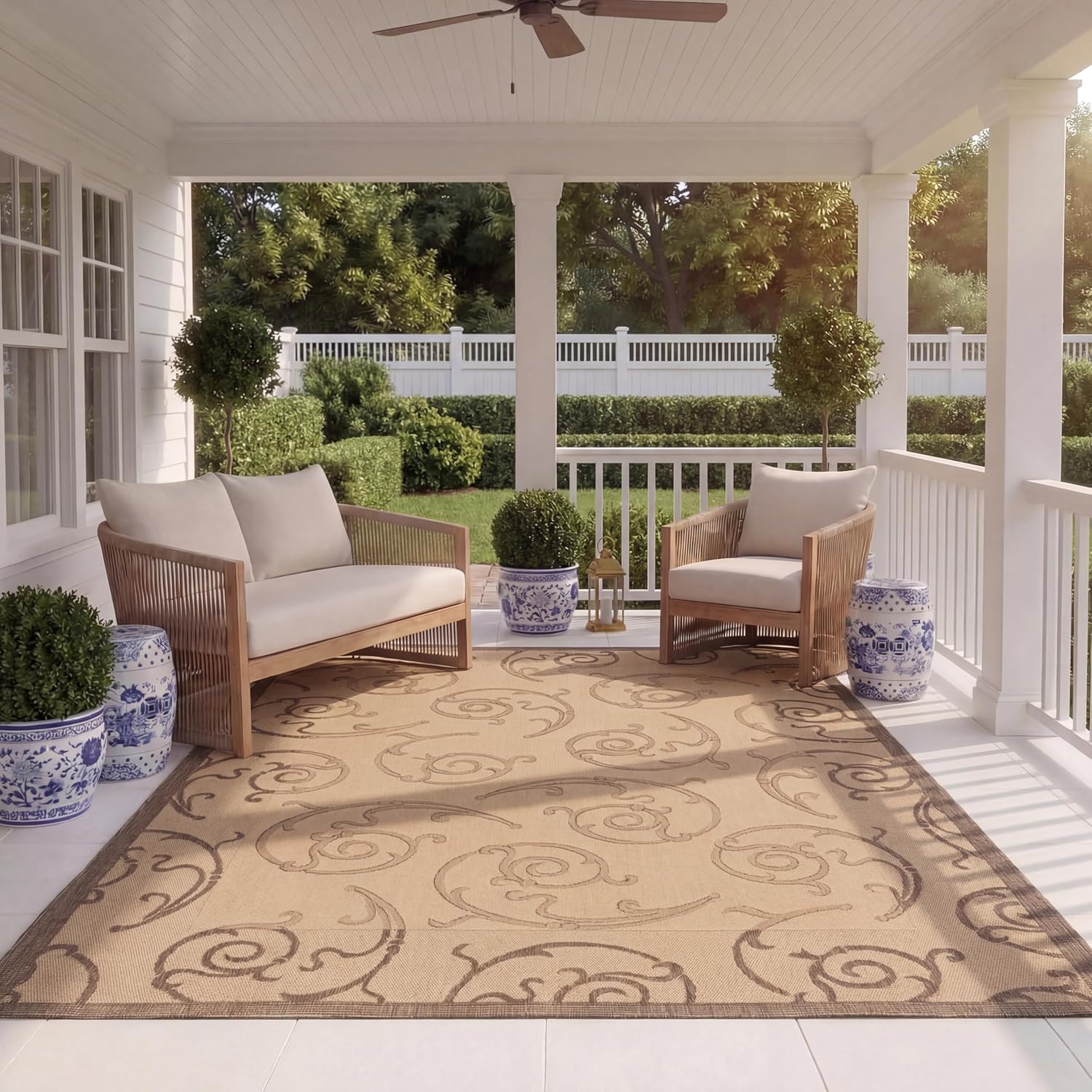 The Safavieh Courtyard collecton uses classic European patterns on modern Indoor/ Outdoor rugs. The high-quality, polypropylene pile fiber adds durability and longevity to these rugs. Each rug is ant to , , sun, water, and all other elements. These rugs are perfect for an outdoor patio, a deck, a portch, or inside in your kitchen or a high-traffic area or childrens playroom. The fringeless borders give a very clean, elegant look and feel.